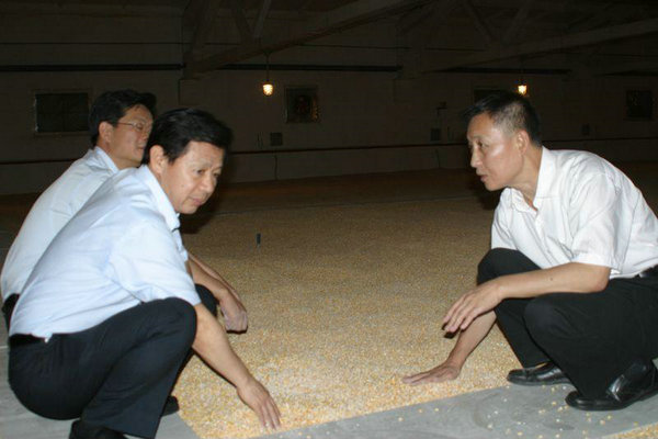 國家糧食局紀檢組長(cháng)趙中權和杜政院長(cháng)在倉內查看糧情